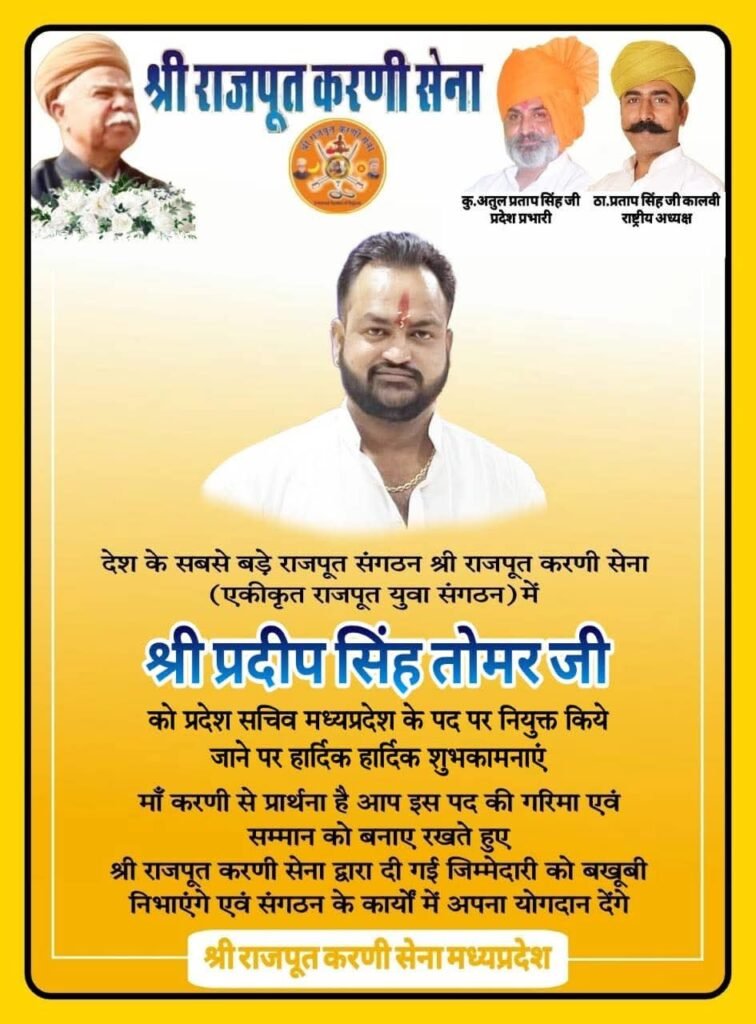 शिवपुरी: श्री राजपूत करणी सेना एकीकृत राजपूत युवा संगठन के प्रदीप तोमर प्रदेश सचिव बनाए गए हैं. बता दें की श्री राजपूत करणी सेवा के…