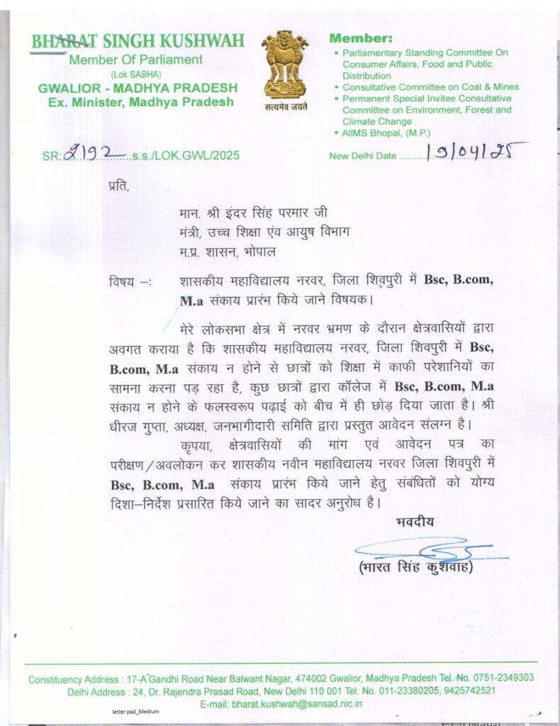शिवपुरी: ग्वालियर क्षेत्र के लोकप्रिय सांसद भारत सिंह कुशवाह द्वारा उच्च शिक्षा मंत्री को नरवर शासकीय महाविद्यालय में बीएससी बीकॉम MA संकाय प्रारंभ करने बीते…