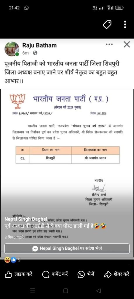 शिवपुरी: जिले के जिलाध्यक्ष का आज गठन हुआ हैं. जिला चुनाव अधिकारी शिवपुरी शैलेन्द्र शर्मा ने शिवपुरी से जिलाध्यक्ष जसवंत जाटव को घोषित किया हैं.…