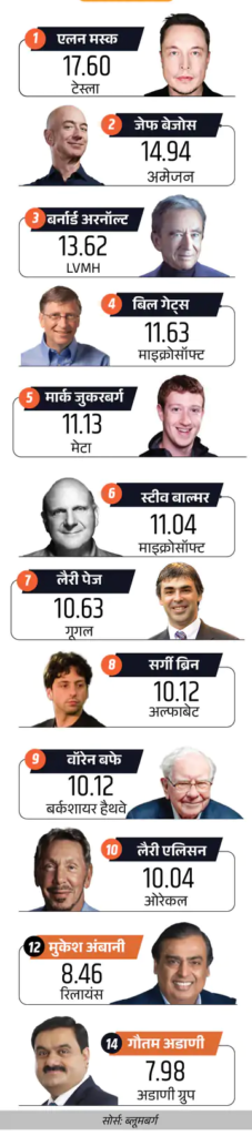 इलेक्ट्रिक व्हीकल कंपनी टेस्ला के CEO एलन मस्क 17.60 लाख करोड़ रुपए की नेटवर्थ के साथ दुनिया के सबसे अमीर कारोबारी हैं। उनके बाद 14.94 लाख करोड़ रुपए की नेटवर्थ के साथ अमेजन के फाउंडर जेफ बेजोस और तीसरे नंबर पर LVMH के बर्नार्ड अरनॉल्ट हैं। उनकी नेटवर्थ 13.62 लाख करोड़ रुपए है।