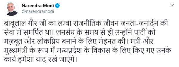 प्रधानमंत्री नरेंद्र मोदी ने ट्वीट कर श्रद्धांजलि अर्पित की है। बाबूलाल गौर जी का लंबा राजनीतिक जीवन जनता-जनार्दन की सेवा में समर्पित था। जनसंघ के समय से ही उन्होंने पार्टी को मज़बूत और लोकप्रिय बनाने के लिए मेहनत की। मंत्री और मुख्यमंत्री के रूप में मध्यप्रदेश के विकास के लिए किए गए उनके कार्य हमेशा याद रखे जाएंगे। बाबूलाल गौर जी के निधन से गहरा दुःख हुआ। ईश्वर शोक संतप्त परिवार को दुःख की इस घड़ी में धैर्य और संबल प्रदान करे। ओम शान्ति!