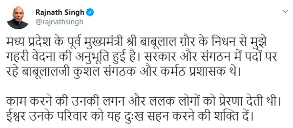 देश के रक्षा मंत्री राजनाथ सिंह ने ट्वीट कर लिखा है कि मध्यप्रदेश के पूर्व मुख्यमंत्री बाबूलाल गौर के निधन से मुझे गहरी वेदना की अनुभूति हुई है। सरकार और संगठन में पदों पर रहे बाबूलालजी कुशल संगठक और कर्मठ प्रशासक थे। काम करने की उनकी लगन और ललक लोगों को प्रेरणा देती थी। ईश्वर उनके परिवार को यह दुःख सहन करने की शक्ति दें।