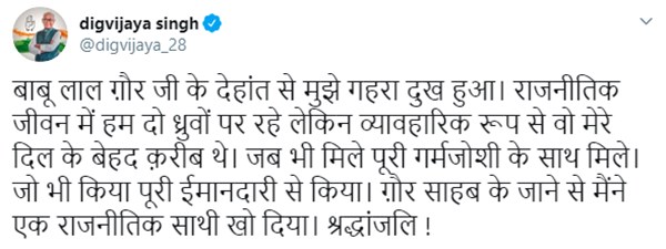 मध्यप्रदेश के पूर्व सीएम और कांग्रेस नेता दिग्विजय सिंह ने बाबूलाल गौर के निधन पर दुख जताया है। ट्वीट कर उन्होंने कहा कि गौर जी के देहांत से मुझे गहरा दुख हुआ। राजनीतिक जीवन में हम दो ध्रुवों पर रहे लेकिन व्यावहारिक रूप से वो मेरे दिल के बेहद करीब थे। जब भी मिले पूरी गर्मजोशी के साथ मिले। जो भी किया पूरी ईमानदारी से किया। गौर साहब के जाने से मैंने एक राजनीतिक साथी खो दिया। श्रद्धांजलि!