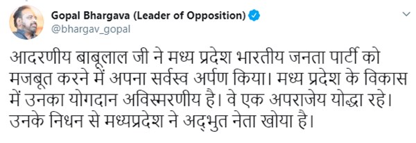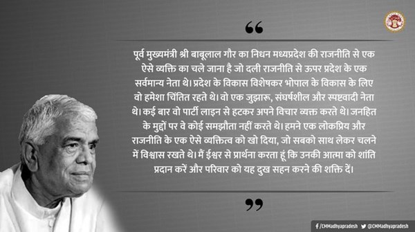 मध्यप्रदेश के मुख्यमंत्री कमलनाथ ने ट्वीट कर लिखा है कि पूर्व मुख्यमंत्री बाबूलाल गौर का निधन मध्यप्रदेश की राजनीति से एक ऐसे व्यक्ति का चले जाना है जो दली राजनीति से ऊपर प्रदेश के एक सर्वमान्य नेता थे।