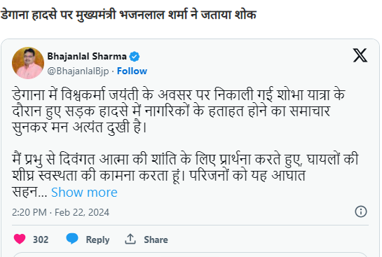 जानकारी के अनुसार जांगिड़ समाज की ओर से शोभायात्रा निकाली जा रही थी। करवा गली के पास पीछे धीरे-धीरे चल रही बोलेरो के ड्राइवर ईशाक खान (60) पुत्र जवरुदीन को हार्ट अटैक आ गया और वह गाड़ी से नियंत्रण खो बैठा।