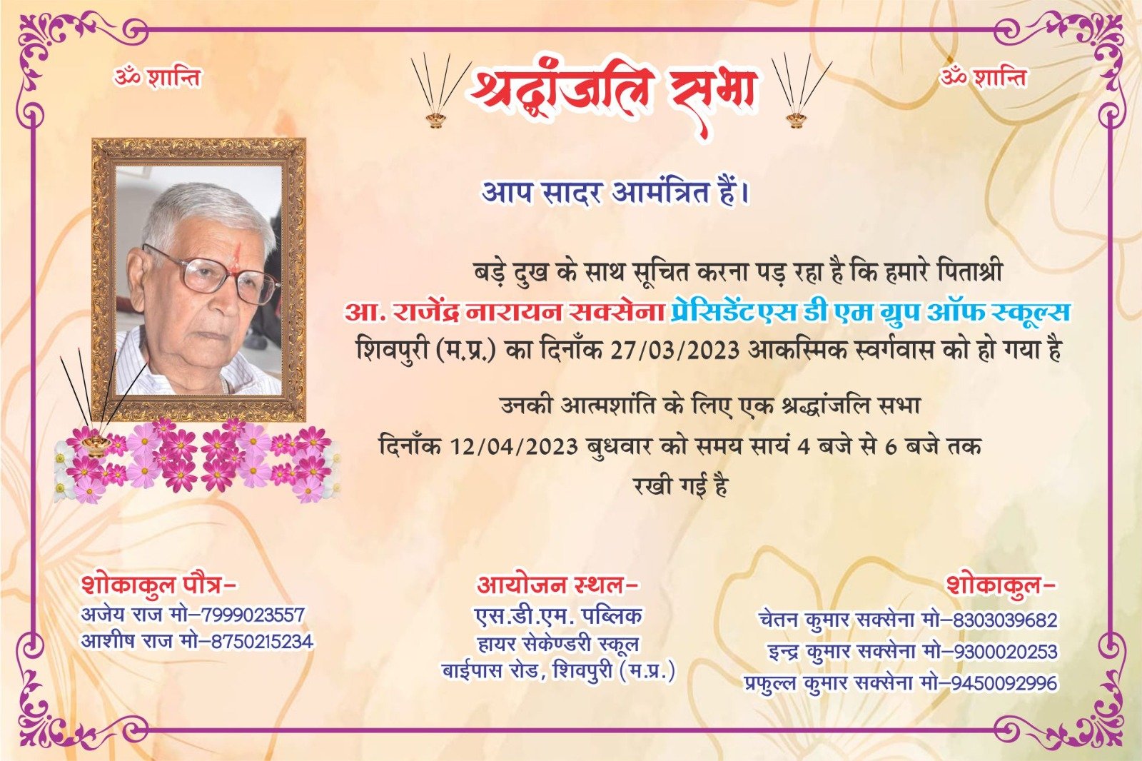 शिवपुरी: बड़े दुख के साथ सूचित करना पड़ रहा है कि हमारे पिताश्री आ. राजेंद्र नारायन सक्सेना प्रेसिडेंट एस डी एम ग्रुप ऑफ स्कूल्स –…
