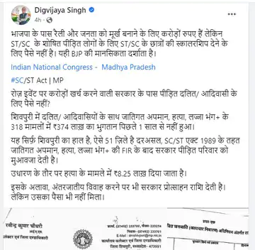 शिवपुरी: कांग्रेस के वरिष्ठ नेता एवं मध्यप्रदेश के पूर्व मुख्यमंत्री दिग्विजय सिंह ने मध्यप्रदेश की भाजपा सरकार का घेराव शिवपुरी जिले में लंबित पड़ी स्वीकृत…
