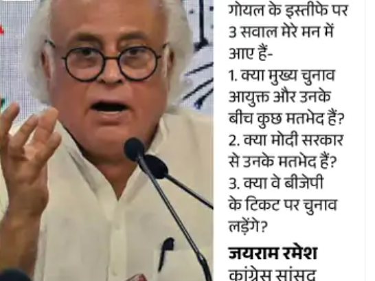 चुनाव आयोग के सूत्रों के मुताबिक, गोयल और CEC राजीव कुमार के बीच फाइल पर मतभेद हैं। हालांकि, गोयल ने इस्तीफे के लिए निजी कारणों का हवाला दिया है। केंद्र ने उन्हें पद छोड़ने से रोकने की कोशिश की थी।गोयल की सेहत भी ठीक है। इसलिए खराब स्वास्थ्य के कारण इस्तीफे की अटकलों को खारिज किया गया है।