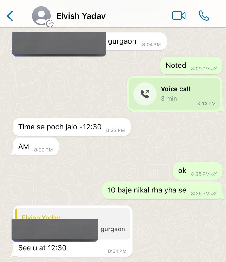 एल्विश को यह बात पसंद नहीं आई। एल्विश यादव ने भी पीड़ित के इसी एक्स पोस्ट को शेयर किया और लिखा- भाई तू दिल्ली में ही रहता है, सोचा याद दिला दूं। इसके बाद पीड़ित ने एक स्क्रीनशॉट शेयर किया। जिसमें वह 10 बजे रात को गुरुग्राम के लिए निकला था। जहां उसकी एल्विश यादव से मुलाकात होनी थी।