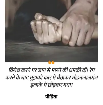इसके बाद युवक ने उसके साथ रेप किया। इसके बाद आरोपी ने पीड़िता को कार में बैठाकर मोहनलालगंज इलाके बिंदौवा पहुंचा। वहां उसे कार से नीचे उतारकर भाग निकला। महिला इसके बाद अपने घर पहुंची और रो-रोकर घर वालों को पूरी बात बताई। इसके बाद वो भाई के साथ थाने आई और आरोपी के खिलाफ मोहनलालगंज में रेप का मामला दर्ज करवाया।