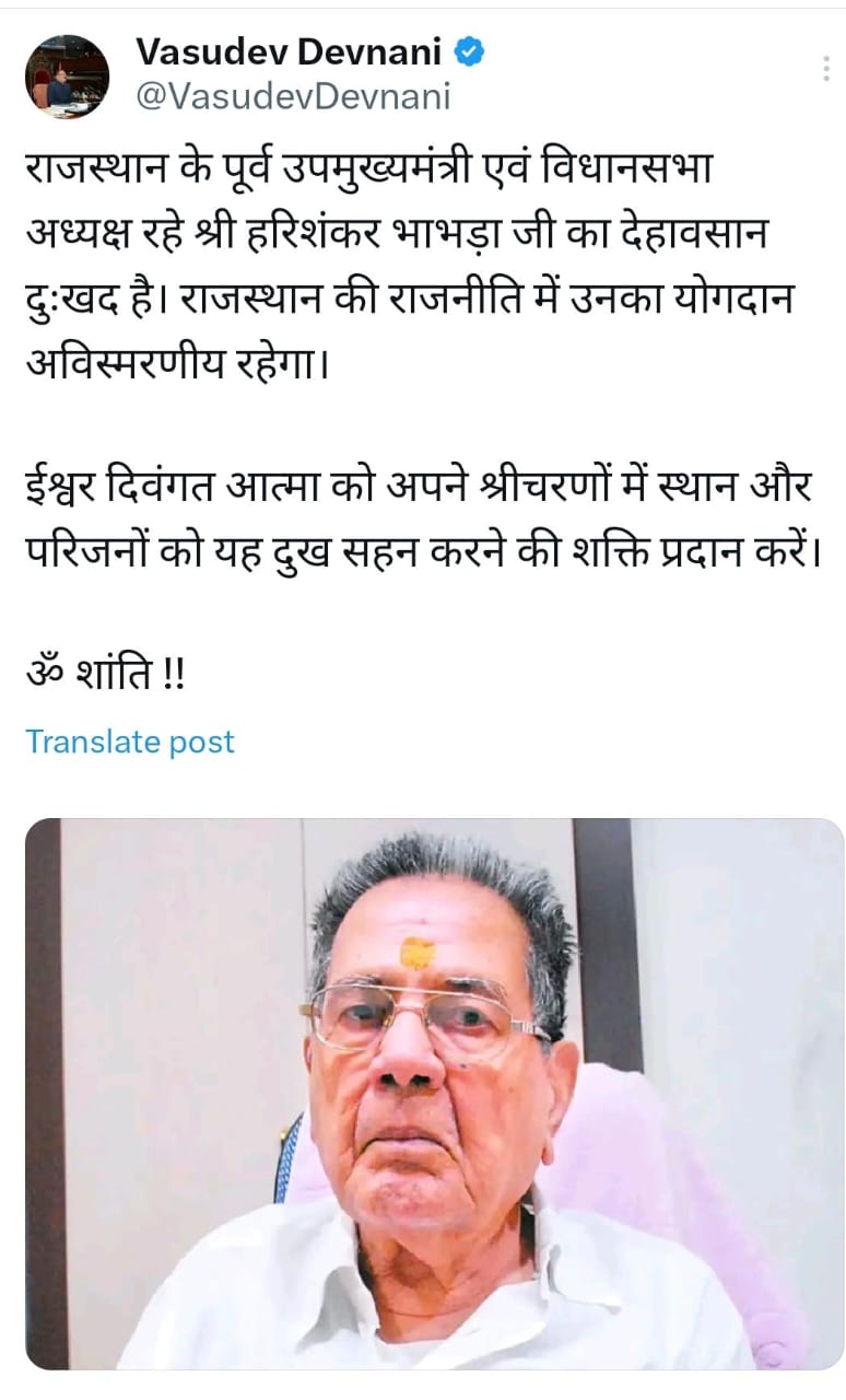राजस्थान के उप मुख्यमंत्री व विधानसभा अध्यक्ष रहे हरिशंकर भाभड़ा का देर रात निधन हो गया। वे लंबे समय से थे। 96 साल की उम्र में जयपुर के रूंगटा अस्पताल में उन्होंने अंतिम सांस ली। उनके निधन के बाद सीएम भजनलाल शर्मा से लेकर विधानसभा अध्यक्ष वासुदेव देवनानी ने शोक व्यक्त किया।