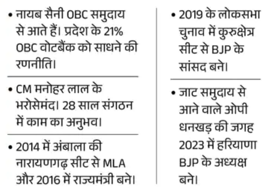 सैनी मनोहर लाल के करीबी हैं। 27 अक्टूबर 2023 को ही उन्हें हरियाणा भाजपा का अध्यक्ष बनाया गया था।