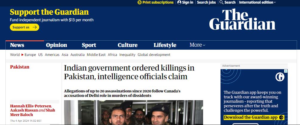 • पाकिस्तान ने टारगेट किलिंग से जुड़े डॉक्यूमेंट्स शेयर किए : भारत और पाकिस्तान के खुफिया अधिकारियों के साथ हुए इंटरव्यू और पाकिस्तानी जांचकर्ताओं से मिले डॉक्यूमेंट्स से साफ पता चलता है कि कैसे भारत की विदेशी खुफिया एजेंसी (RAW) ने 2019 के बाद राष्ट्रीय सुरक्षा के लिए कथित तौर पर विदेशों में हत्याएं करना शुरू किया। रिसर्च एंड एनालिसिस विंग (RAW) को सीधे तौर पर भारत के प्रधानमंत्री नरेंद्र मोदी का ऑफिस कंट्रोल करता है। मोदी इस महीने तीसरे कार्यकाल के लिए चुनाव लड़ रहे है।
