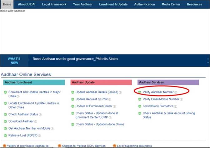 यहां दिए गए Verify Aadhaar Number विकल्प पर क्लिक करें।