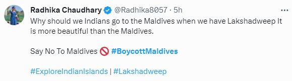 इससे मालदीव के मंत्री और नेता नाराज नजर आए। उनके आपत्तिजनक पोस्ट के बाद सोशल मीडिया पर भारतीयों और मालदीव के नागरिकों के बीच जंग छिड़ गई। भारत के लोगों का गुस्सा इतना बढ़ गया कि देश में हैशटैग BoycottMaldives ट्रेंड करने लगा। लोग मालदीव का जमकर विरोध करने लगे। लोगों का कहना है कि PM मोदी के लक्षद्वीप दौरे से मालदीव के टूरिज्म को तगड़ा झटका जरूर लगने वाला है। दूसरी तरफ नेटीजन्स भारत के टूरिज्म सेक्टर को #ExploreIndianIsland से सपोर्ट करने लगे।
