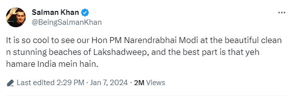 सोशल मीडिया पर एक यूजर ने PM मोदी का लक्षद्वीप वाला वीडियो शेयर करते हुए लिखा- बढ़िया कदम है! यह मालदीव की नई सरकार के लिए एक बड़ा झटका है, जो चीन की कठपुतली है। इस दौरे के बाद लक्षद्वीप में पर्यटन को भी बढ़ावा मिलेगा।
