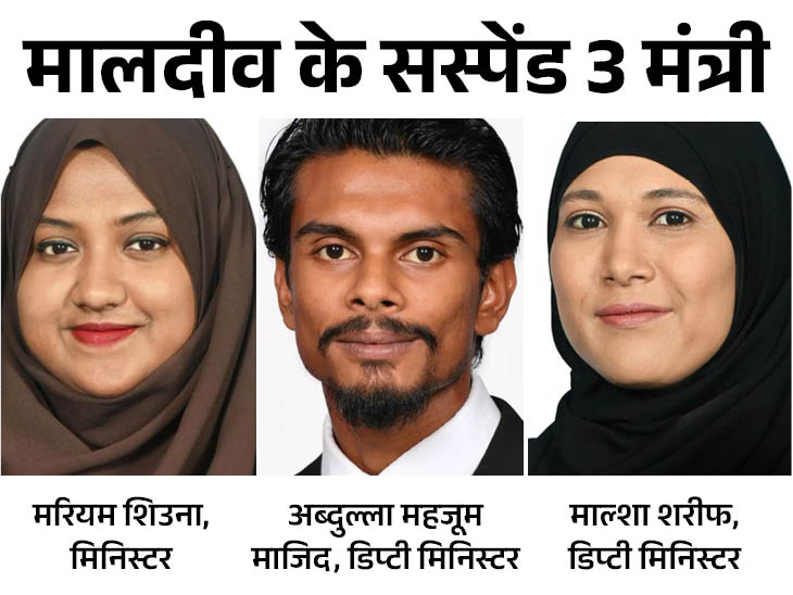 उधर, मालदीव सरकार ने अपने 3 मंत्रियों माल्शा शरीफ, मरियम शिउना और अब्दुल्लाह महजूम माजिद को निलंबित कर दिया है। इन्होंने ही PM मोदी और भारत के खिलाफ टिप्पणी की थी। साथ ही भारत की टूरिज्म सेक्टर में फेसेलिटीज को लेकर भी कमेंट्स किए थे।