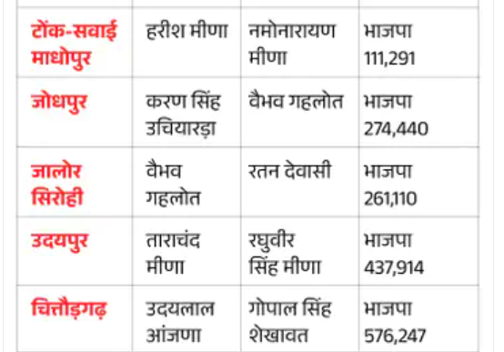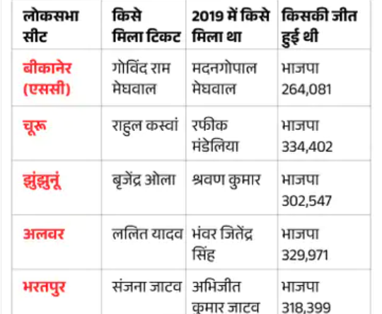 कांग्रेस ने सभी 10 सीटों पर नए उम्मीदवार उतारे हैं। पिछली बार के किसी उम्मीदवार को सेम सीट पर टिकट नहीं दिया है। पूर्व सीएम अशोक गहलोत के बेटे वैभव गहलोत पिछला चुनाव जोधपुर सीट पर लड़े थे। इसी तरह बीकानेर सीट से पिछले उम्मीदवार मदन गोपाल मेघवाल का टिकट काटकर गोविंद मेघवाल को दिया है। चूरू से पिछले उम्मीदवार रफीक मंडेलिया, झुंझुनूं से श्रवण कुमार, भरतपुर से अभिजीत जाटव और टोंक से नमोनारायण मीणा के टिकट काट दिए हैं। उदयलाल आंजणा को पिछली बार जालोर-सिरोही से टिकट दिया था। इस बार उन्हें चित्तौड़गढ़ से टिकट दिया है। वैभव गहलोत पिछली बार जोधपुर से लड़े थे। इस बार जालोर-सिरोही से उतारा है।