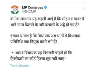 मामले को लेकर एमपी कांग्रेस के एक्स हेंडल पर भी प्रतिक्रिया आई है, ‘कांग्रेस लगातार यह कहती आई है कि मोहन सरकार में थाने न्याय दिलाने के नहीं दलाली के अड्डे हो गए हैं। इसका प्रमाण है कि विधायक अब थानों में विधायक प्रतिनिधि तक नियुक्त करने लगे हैं। शायद विधायक यह निगरानी चाहते हों कि हिस्सेदारी का कोई हिस्सा छूट न जाए।’