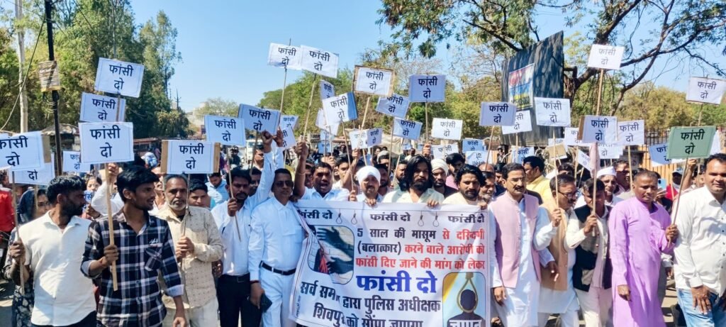 शिवपुरी: जिले के दिनारा में 5 साल की मासूम से हुए वीभत्स बलात्कार के मामले में पूरा जिला आक्रोश में है और आज आरोपी को फांसी को सजा दिए जाने को लेकर आज सर्व समाज ने कलेक्टोरेट कार्यालय में कलेक्टर और पुलिस अधीक्षक को ज्ञापन सौंपा। ज्ञापन से पूर्व सर्व समाज रैली के रूप में पोलोग्राउण्डत से अस्पताल चौराहा होते हुए कलेक्टो रेट पहुंचा जहां नारेबाजी के उपरांत ज्ञापन सौंपा गया। ज्ञापन उपरांत कलेक्टर और पुलिस अधीक्षक को बेटी के समुचित उपचार एवं आरोपी को कडी से कडी समाज दिलवाए जाने हेतु माननीय न्यायालय के संज्ञान में बात लाने की बात कही।