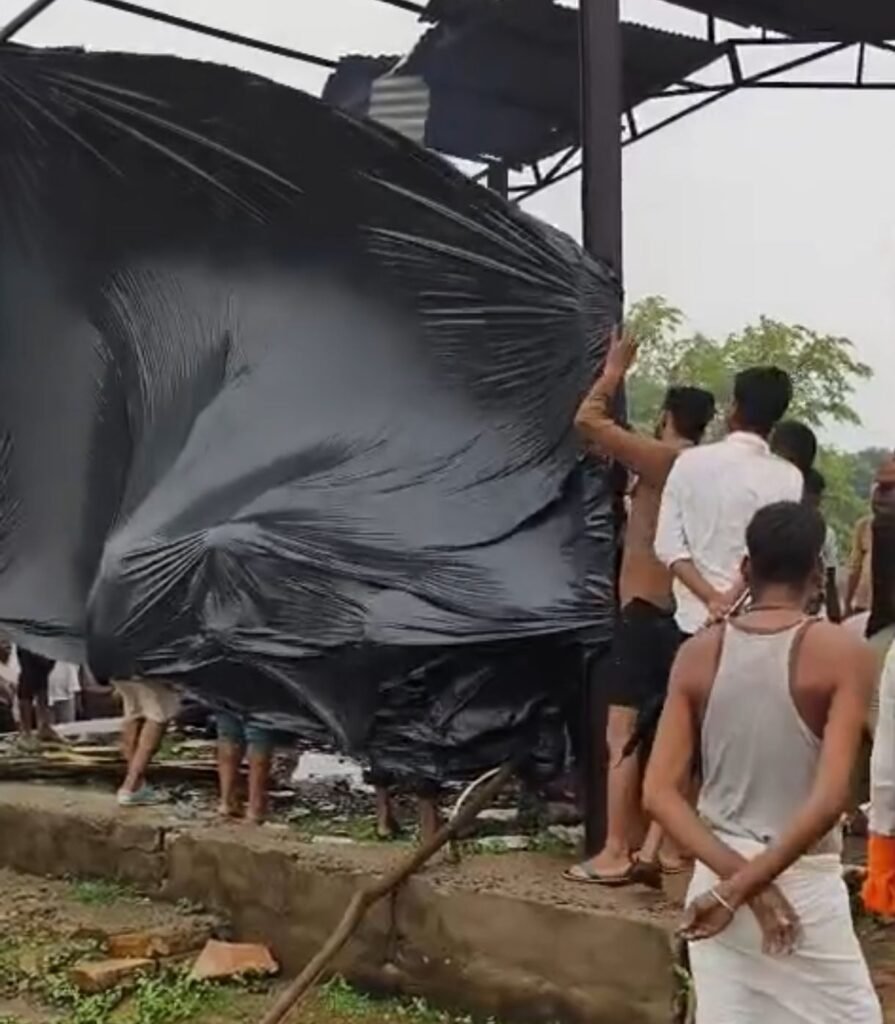 करीब तीन घंटे तक बारिश थमने का इंतजार किया गया, लेकिन जब मौसम में सुधार नहीं हुआ तो मजबूरी में तिरपाल का इंतजाम कर अंतिम यात्रा निकाली गई और बरसते पानी के बीच तिरपाल के नीचे अंतिम संस्कार की प्रक्रिया पूरी की गई।