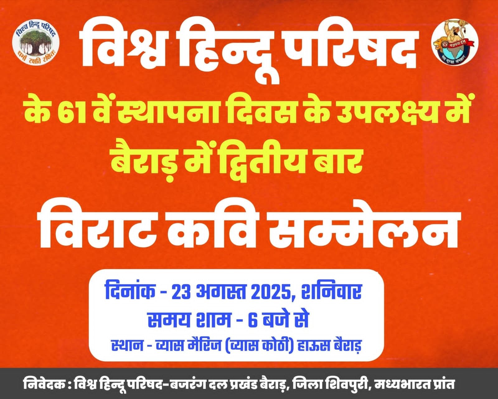 बैराड़ तहसील में बजरंग दल के संयोजक प्रिंस प्रजापति ने जानकारी देते हुए बताया कि विश्व हिन्दू परिषद के 61वें स्थापना दिवस के उपलक्ष्य में कवि सम्मेलन का आयोजन नगरवासियों के सहयोग से किया जा रहा है यह कवि सम्मेलन 23 अगस्त को बैराड़ नगर के व्यास मैरिज गार्डन पर शाम 6 बजे से प्रारंभ होगा। इस कवि सम्मेलन नें हास्य, वीर, ऋंगार, गीतकार-गजलकार आदि रसों के देशभर के प्रख्यात कवि व कवियत्री रहने बाले हैं। इस कवि सम्मेलन में देश में वीर रस के प्रख्यात कवि मुकेश मोलवा, हास्य कवि कुलदीप रंगीला, आशुतोष ओज, कवियत्री पलक सिकरवार, अंजली गुप्ता, कवि शिवम सिसोदिया, प्रदीप अवस्थी, सौरव सरस, श्याम सरल, सतीश किंकर आदि कवि मौजूद रहेंगे। बैराड़ क्षेत्र ही नही जिलेभर मे इस कवि सम्मेलन की चर्चा है और शोशल मीडिया सहित क्षेत्र मे लोग कार्यक्रम के प्रचार-प्रसार मे लगे हुए है।