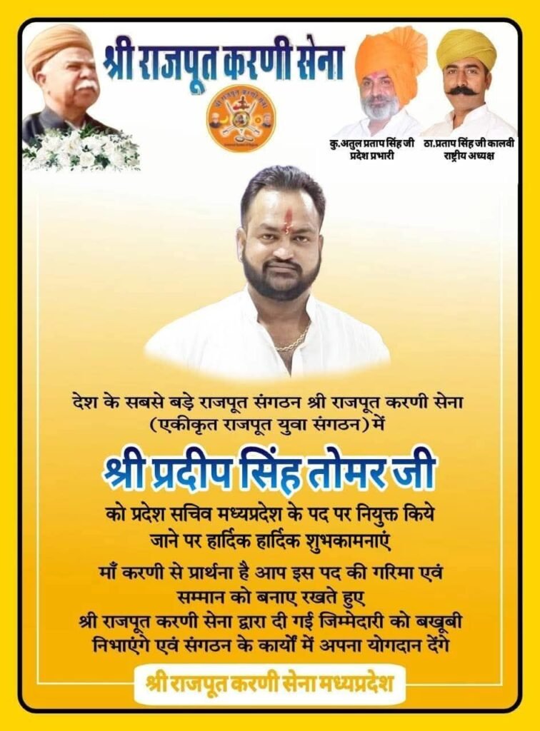 बता दें की श्री राजपूत करणी सेवा के राष्ट्रीय महासचिव एवं प्रदेश प्रभारी कुंवर अतुल प्रताप सिंह की अनुशंसा पर प्रदीप सिंह तोमर को मध्य प्रदेश का प्रदेश सचिव नियुक्त किया गया है. इसके बाद से प्रदीप तोमर को बधाइयों का ताँता लगा हुआ है.