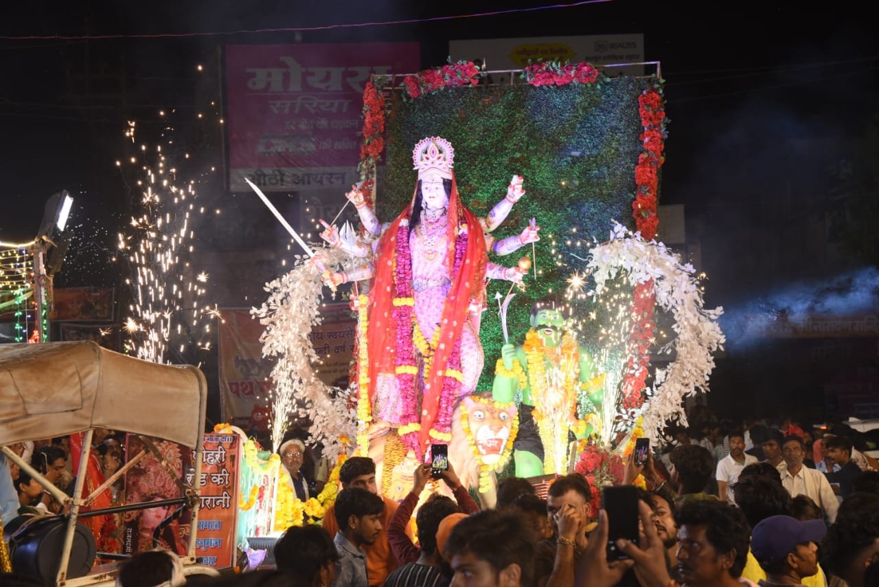 शिवपुरी। श्री नवदुर्गा सांस्कृतिक समारोह मण्डल के तत्वावधान में आयोजित नवरात्रि विसर्जन समारोह ने इस वर्ष एक यादगार छाप छोड़ी। माधव चौक चौराहे पर आयोजित मुख्य कार्यक्रम में देवी प्रतिमाओं के विसर्जन के क्रम में एक भव्य मंच सजाया गया, जहाँ से विभिन्न स्थानों पर स्थापित माताओं की मनमोहक झाँकियाँ और सुंदर विमान अत्यंत आकर्षक ढंग से निकाले गए।