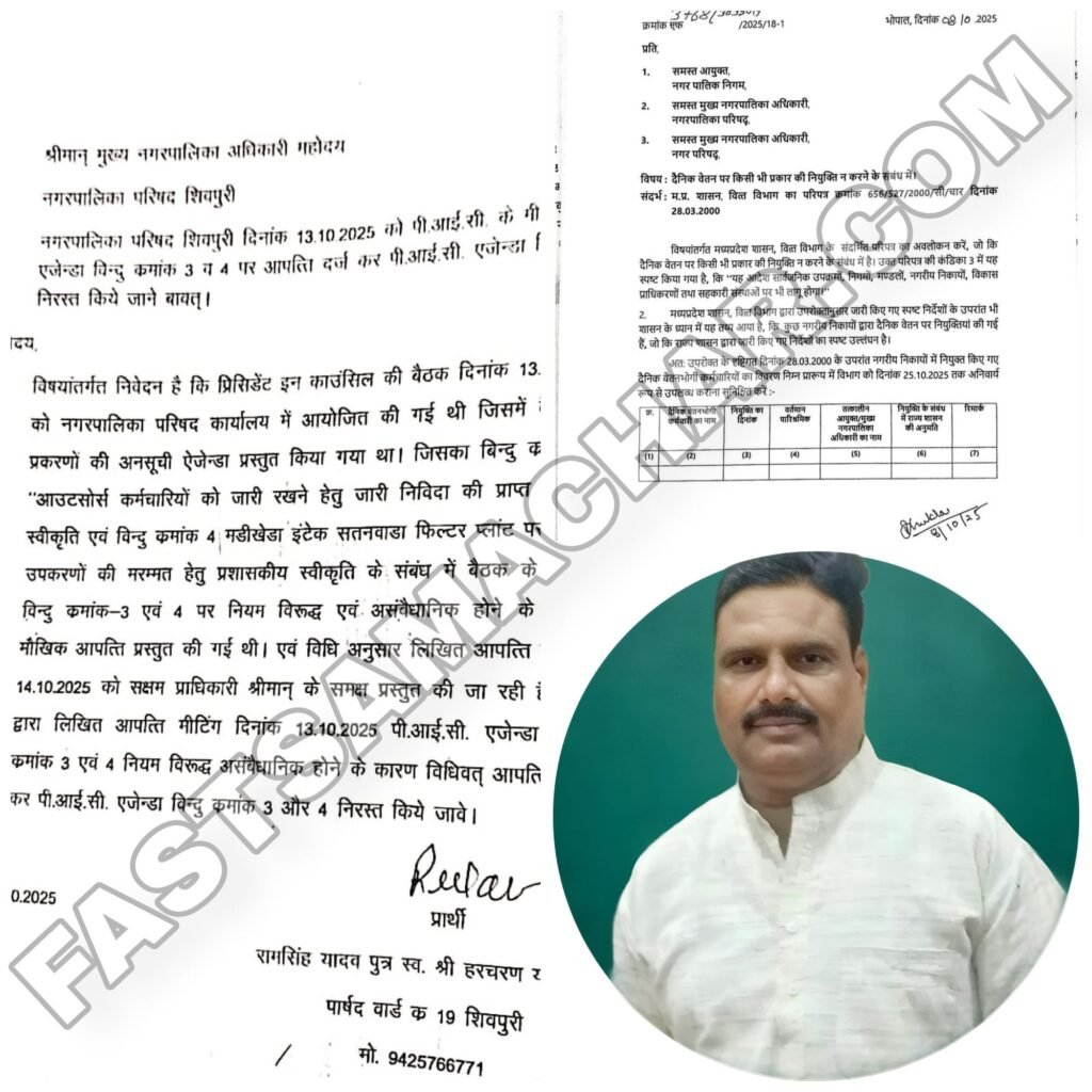 जानकारी के अनुसार 13 अक्टूबर 2025 को पीआईसी मीटिंग रखी गई थी. मीटिंग एजेंडा बिंदु 3 और 4 पर आपत्ति दर्ज कराते हुए वार्ड क्रमांक 19 के पार्षद राम सिंह यादव पुत्र स्वर्गीय हरचरण यादव ने मुख्य नगर पालिका अधिकारी को बिंदुओं को निरस्त करने की मांग की है.