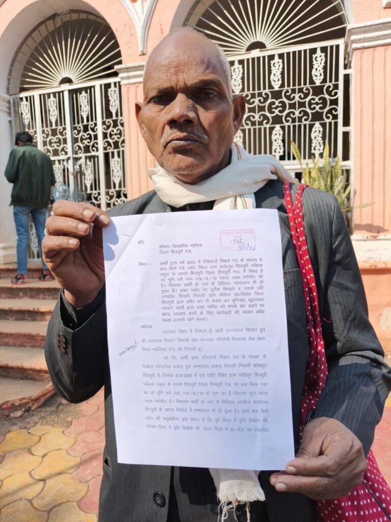 शिवपुरी। खबर कलेक्ट्रेट कार्यालय से है जहाँ जनसुनवाई जहां में निवासी रामगोपाल शिवहरे ने अपने फतेहपुर स्थित प्लॉट पर अवैध कब्जे की शिकायत दर्ज कराई है। पीड़ित ने बताया कि उन्होंने वर्ष 2005 में फतेहपुर, शिवपुरी पब्लिक स्कूल के सामने स्थित सर्वे नंबर 179/6/10 का 1200 वर्गफीट का प्लॉट विधिवत रजिस्टर्ड विक्रय पत्र के माध्यम से खरीदा था। इस भूमि का नामांतरण भी तहसील कार्यालय शिवपुरी में उनके नाम पर दर्ज है।
