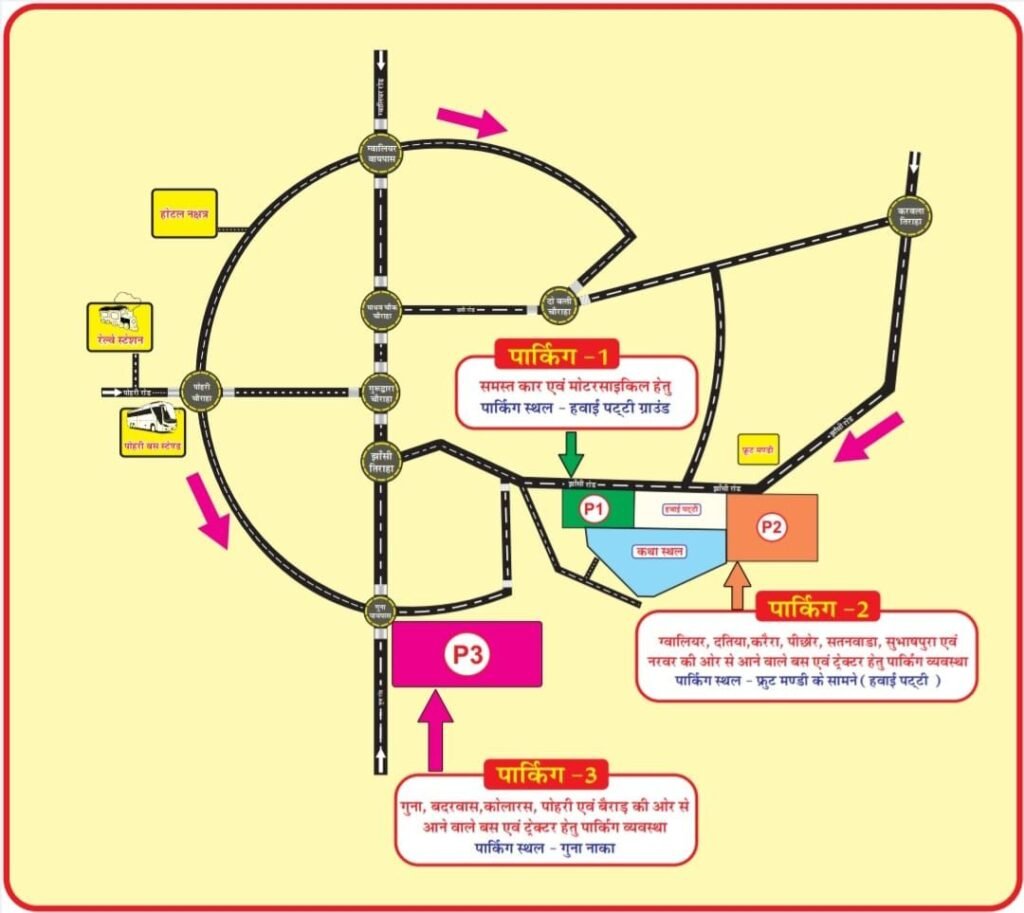 ग्वालियर, सतनवाड़ा, सुभाषपुरा, दतिया, करेरा, पिछोर दिशा से आने वाले वाहनों की पार्किंग व्यवस्था फ्रूट मंडी सामने हवाई पट्टी पार्किंग क्रमांक 2 में की गई है।