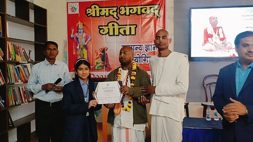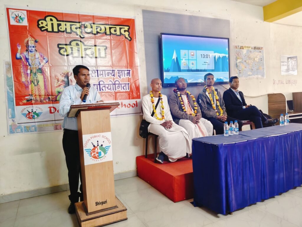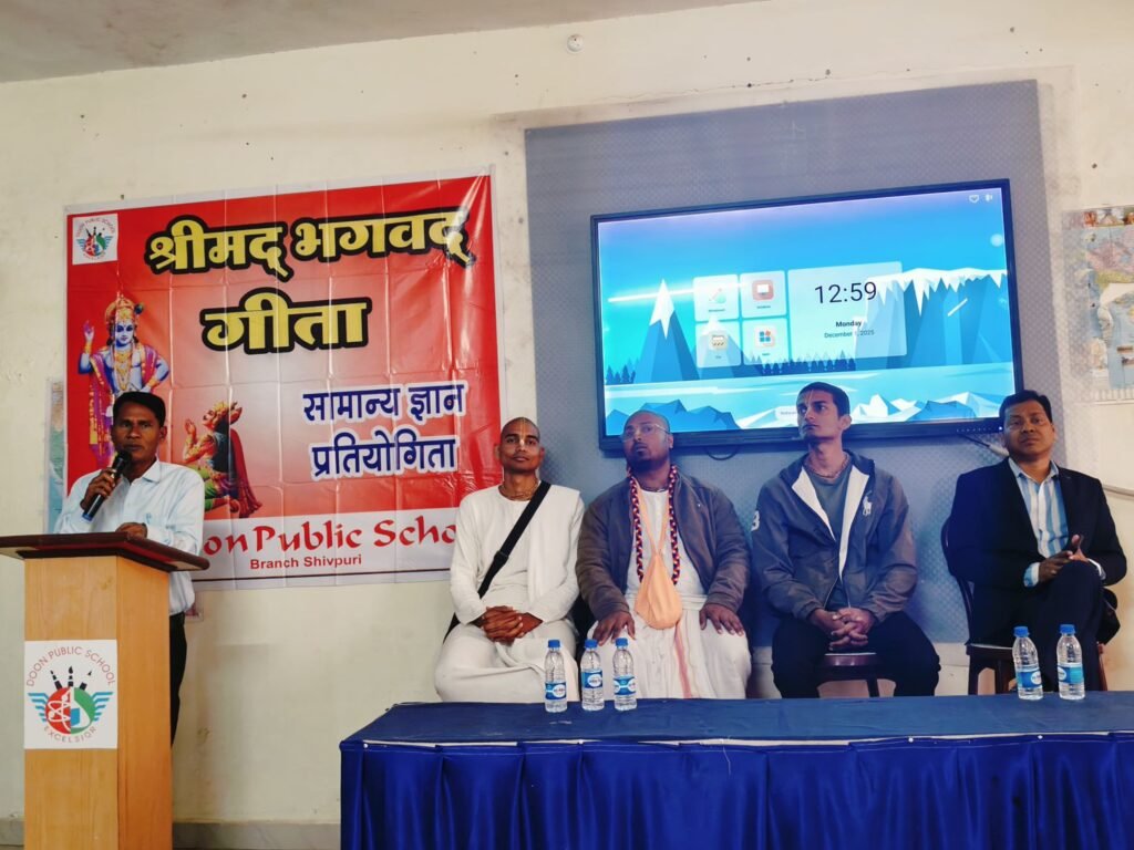 शिवपुरी: भगवत गीता के सात सौ श्लोक हैं जो हमारे जीवन को बदल देते हैं। विद्यार्थियों को स्कूल स्तर से ही गीता का अध्ययन करना चाहिए ताकि वे जीवन जीने की कला सीख सकेंगे। उक्त विचार गीता जयंती के अवसर पर दून पब्लिक स्कूल शिवपुरी में आयोजित समारोह में इस्कॉन के प्रभु जी जीतेन्द्रीय दास ने अपने उद्बोधन में कही। आपने विद्यार्थियों को सफलता के पाँच सूत्र बताए – माइंड इज योर मांइड, डोन्ट कम्पेयर विद अदर,डोन्ट रन अवे ,पार्टीसिपेट वी बेस्ट वर्जन ऑफ योर सेल्फ, फेथ इन गॉड।