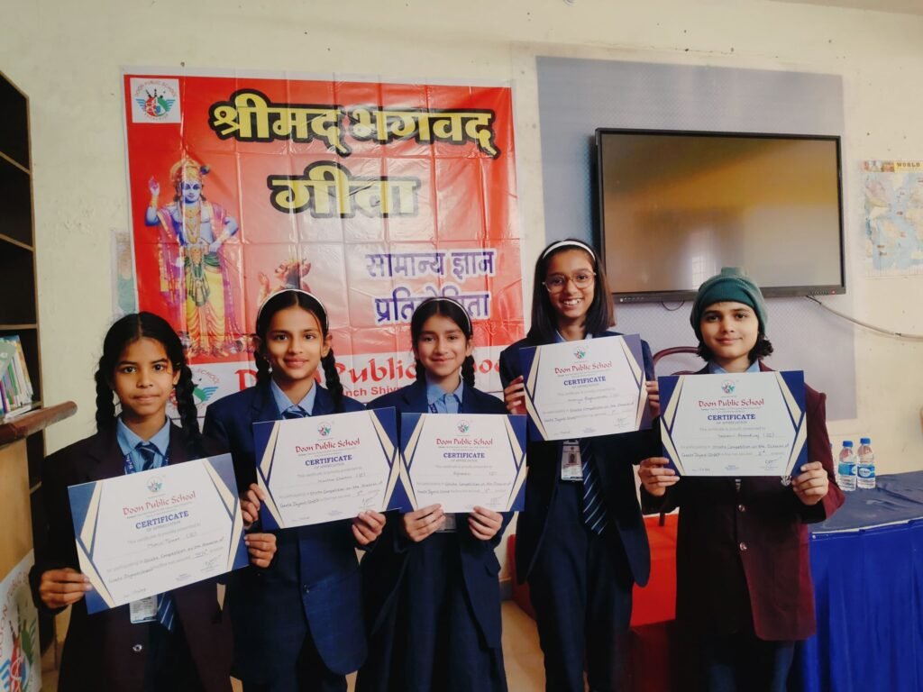 मोहिनी तोमर, आरान्या रद्युवंशी,यशस्वी भारद्वाज,नीश्ता चौहान,राज नन्दिनी भार्गव,रिशिका शर्मा सहित अन्य छात्र-छात्राओं ने गीता के श्लोक एवं उसका भावार्थ प्रस्तुत कर दर्शकों को अभिभूत कर दिया। विजेता छात्रों को पुरस्कृत किया गया।