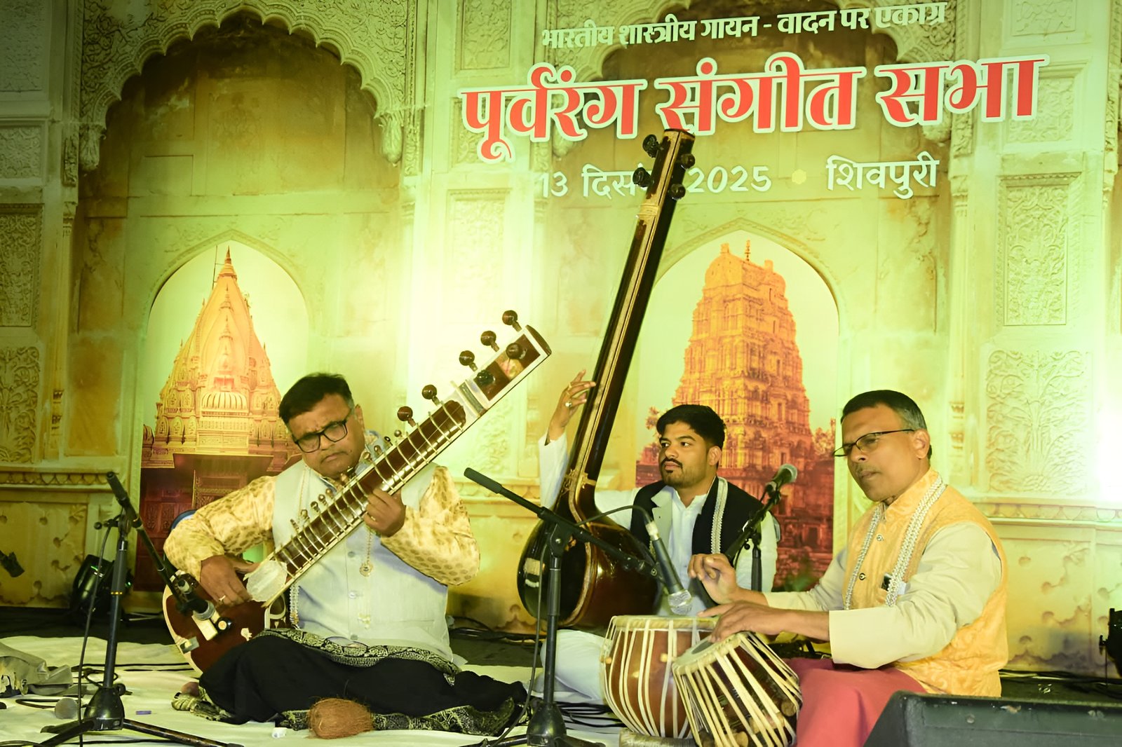 मंचासीन अतिथियों का शुभम डांगोडे जिला आबकारी अधिकारी शिवपुरी एवं सौरभ गौड़ पीओ डूडा द्वारा मोतियों की माला पहनाकर स्वागत किया गया। कार्यक्रम का शुभारंभ तिरूपति संगीत कला महाविद्यालय शिवपुरी के विद्यार्थियों द्वारा प्रियंका पुरोहित के निर्देशन में सरस्वती वंदना के साथ किया गया। इसके बाद स्थानीय गायिका विजेता शर्मा, बैराड़ शिवपुरी द्वारा गायन की प्रस्तुति दी गई। सागर से पधारे यश गोपाल श्रीवास्तव एवं साथी कलाकारों द्वारा मंत्रमुग्ध कर देने वाली प्रस्तुतियां दी गयी, जिसको श्र्रोताओं द्वारा सराहा गया। इसके पश्चात् भोपाल से पधारे अम्बरीष गंगराडे एवं तबले पर साथी कलाकार दिवाकर जी भट्ट द्वारा सितार वादन की अपनी बेहतरीन प्रस्तुति से उपस्थित श्र्रोताओं को भाव-विभोर कर आनंदित किया। जिससे संपूर्ण हॉल तालियों की गड़-गड़ाहट से गूंज उठा।