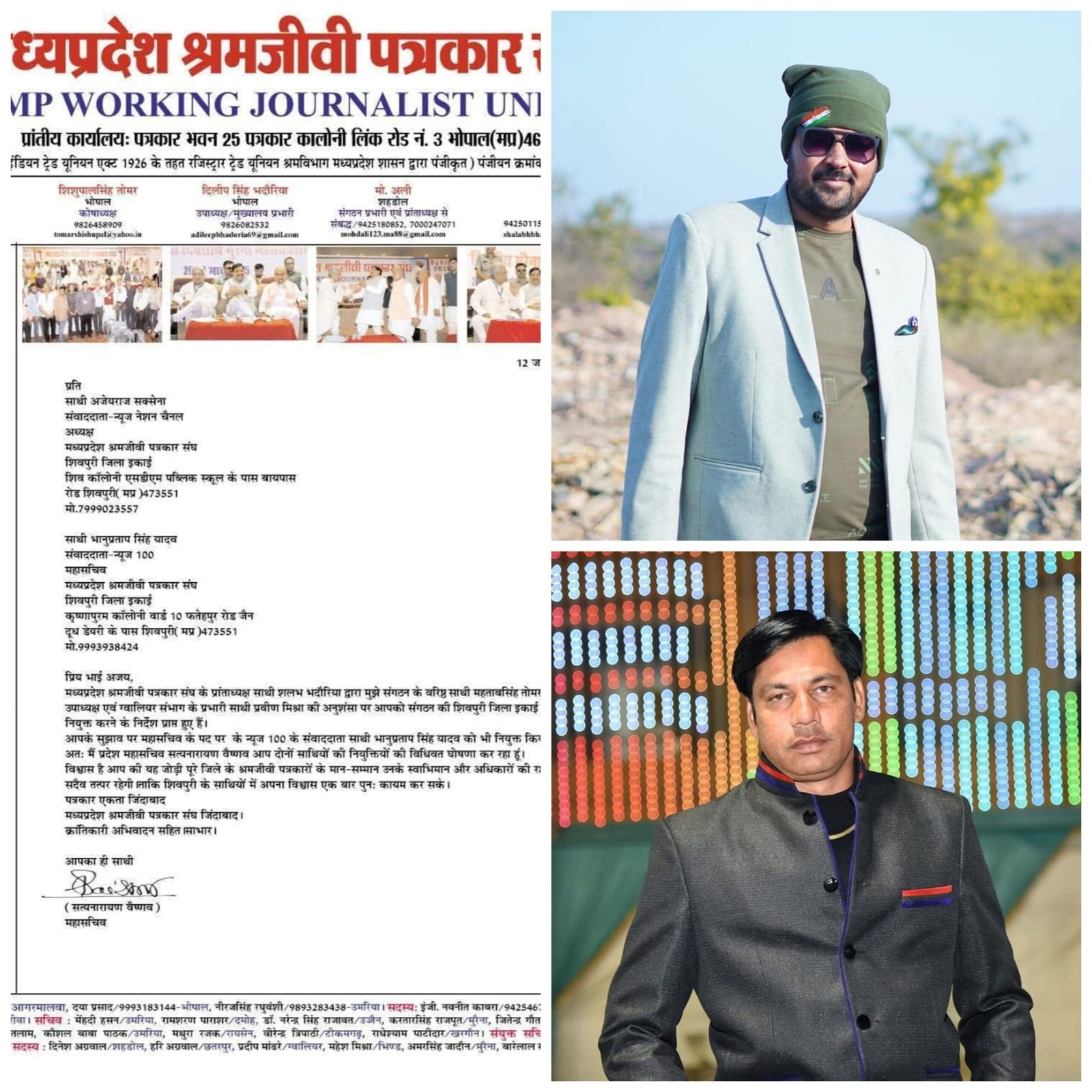 मध्य प्रदेश श्रमजीव पत्रकार संघ के प्रांत अध्यक्ष शलभ भदौरिया द्वारा संगठन के वरिष्ठ साथी मेहताब सिंह तोमर एवं प्रदेश उपाध्यक्ष एवं ग्वालियर संभाग के प्रभारी प्रवीण मिश्रा, प्रहलाद सिंह भदौरिया, गजेंद्र इंगले संभागीय अध्यक्ष की अनुशंसा पर पत्रकारों के हितों की रक्षा, संगठन को सुदृढ़ करने एवं पत्रकारिता की गरिमा बनाए रखने के उद्देश्य से की गई हैं। नव-नियुक्त पदाधिकारियों के चयन पर जिले के पत्रकार साथियों एवं गणमान्य नागरिकों ने हर्ष व्यक्त करते हुए शुभकामनाएं प्रेषित की हैं।