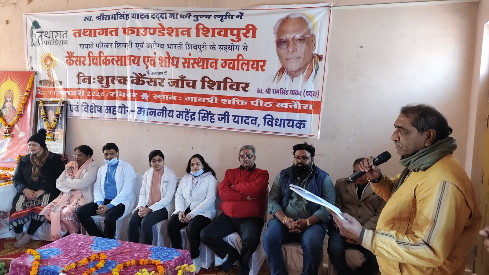 शिवपुरी। समाजसेवी संस्था तथागत फाउंडेशन के द्वारा रविवार को कोलारस विधानसभा क्षेत्र के खतौरा ग्राम में पूर्व विधायक एवं वरिष्ठ नेता स्व रामसिंह दादा की स्मृति में गायत्री शक्तिपीठ परिसर में वृहद निःशुल्क कैंसर परीक्षण शिविर लगाया गया। जिसमें 186 लोगों ने परीक्षण कराया और शिविर का लाभ प्राप्त किया,इस शिविर में सहयोगी के रूप में गायत्री परिवार,आरोग्य भारती तथा स्वास्थ्य विभाग रहा।