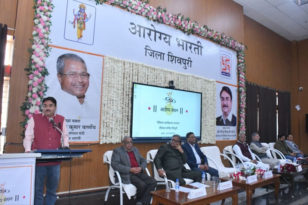 हमारी प्रकृति आधारित दिनचर्या होनी चाहिए,अगर हम उसका पालन नियमित रूप से करते हैं तो ये हमें आरोग्य बनाने में बहुत सहायक होती हैं। ये वक्तव्य आरोग्य भारती के राष्ट्रीय संगठन मंत्री अशोक कुमार वार्ष्णेय ने आरोग्य भारती जिला शिवपुरी के द्वारा बुधवार को श्रीमंत राजमाता विजया राजे सिंधिया चिकित्सा महाविद्यालय में आरोग्य मंथन पर एक विशेष कार्यक्रम में कहे। उन्होंने कहा कि हमें मौसम ऋतु अनुसार स्थान के हिसाब स्थानीय खाद्य पदार्थ का सेवन करना चाहिए। बताया कि आरोग्य भारती समूचे देश में लोक स्वास्थ्य के क्षेत्र में कार्य कर रही हैं इसके 901 जिलों में कार्यकर्ता हर स्तर पर कार्य कर रहे हैं।