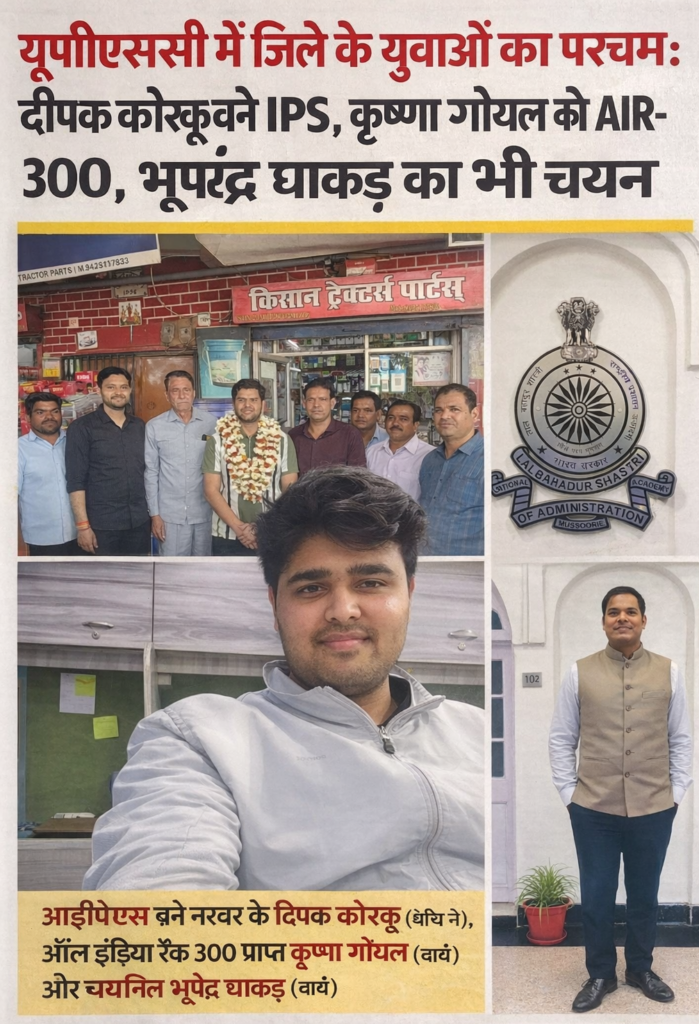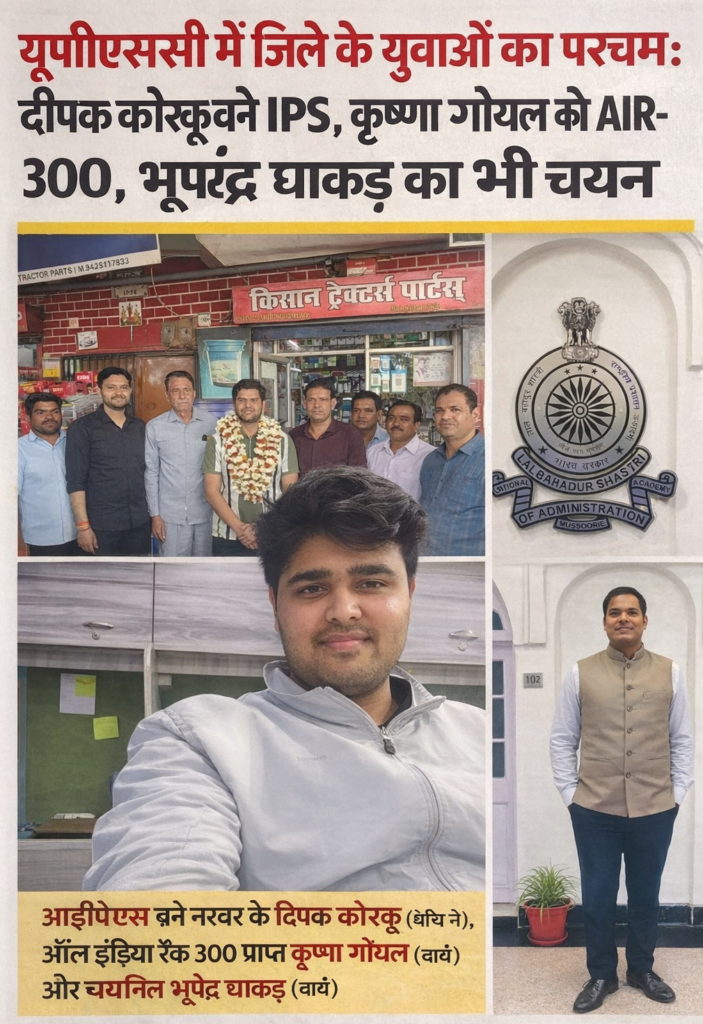 जिले के नरवर क्षेत्र के दीपक कोरकू का चयन आईपीएस (भारतीय पुलिस सेवा) के लिए हुआ है। उनकी इस उपलब्धि से मगरौनी सहित पूरे क्षेत्र में खुशी की लहर है और लोग उन्हें बधाई दे रहे हैं। दीपक की सफलता से क्षेत्र के युवाओं को भी प्रेरणा मिली है।