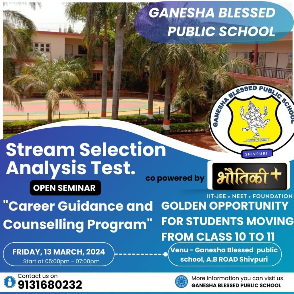 शिवपुरी। कक्षा 10वीं से 11वीं में जाने वाले विद्यार्थियों और उनके अभिभावकों के लिए शहर में एक विशेष अवसर उपलब्ध कराया जा रहा है। Ganesha Blessed Public School शिवपुरी और Bhautikii Plus ग्वालियर के संयुक्त तत्वावधान में Stream Selection Analysis Test (SSAT) एवं करियर गाइडेंस सेमिनार का आयोजन किया जा रहा है।