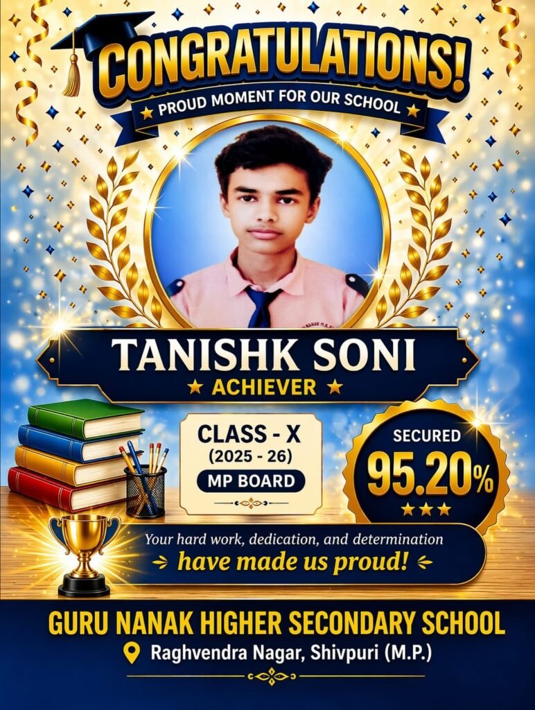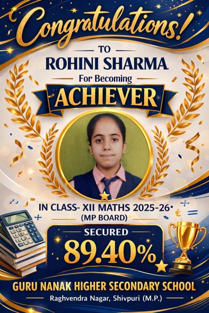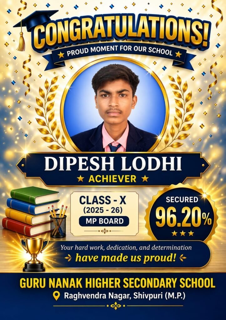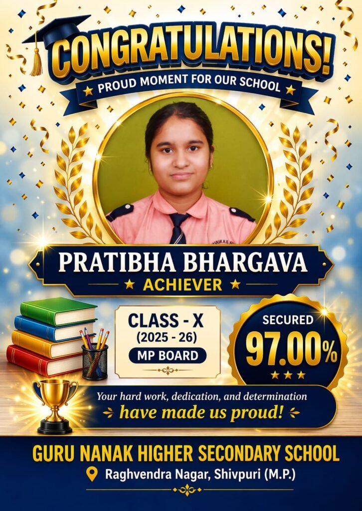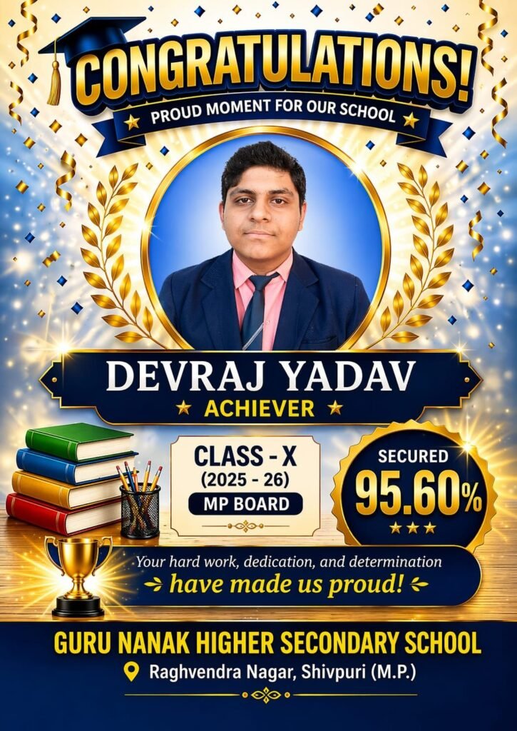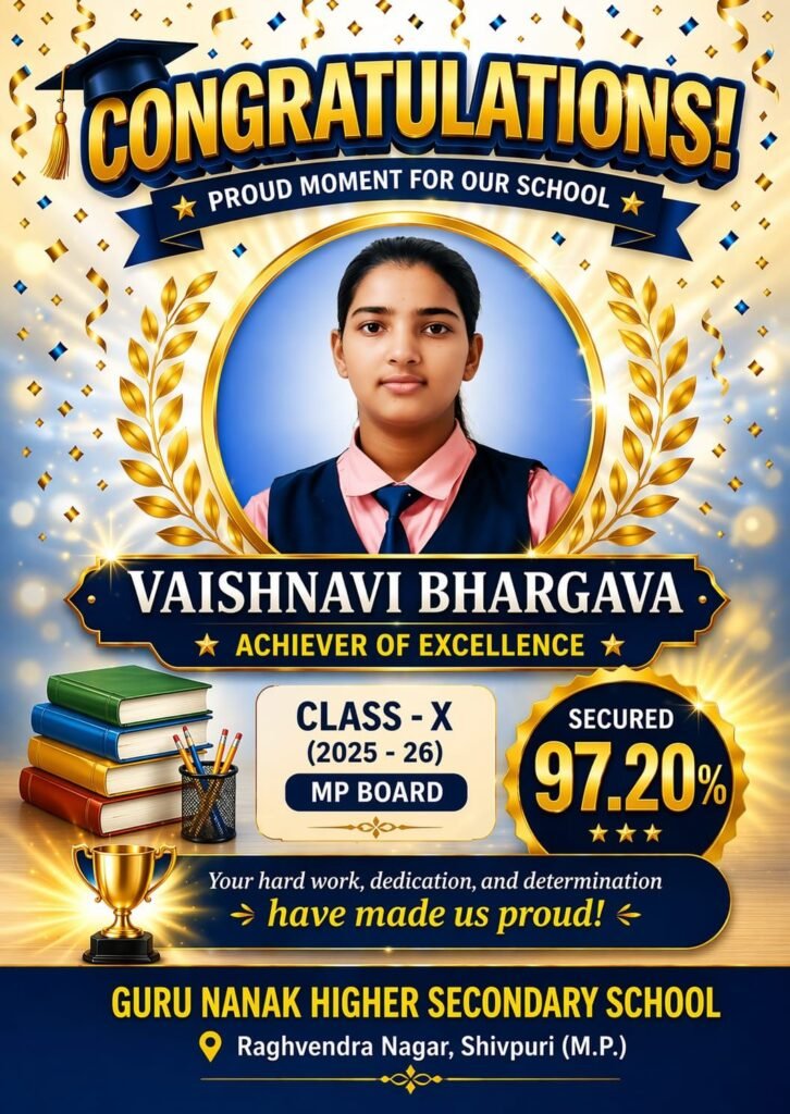 शिवपुरी। शहर के राघवेंद्र नगर स्थित गुरु नानक हायर सेकेंडरी स्कूल ने MP बोर्ड परीक्षा 2025-26 में उत्कृष्ट प्रदर्शन करते हुए एक बार फिर अपनी शैक्षणिक गुणवत्ता साबित की है। 10वीं और 12वीं के छात्रों के शानदार परिणाम से स्कूल में खुशी का माहौल है।