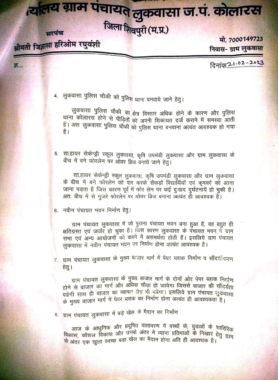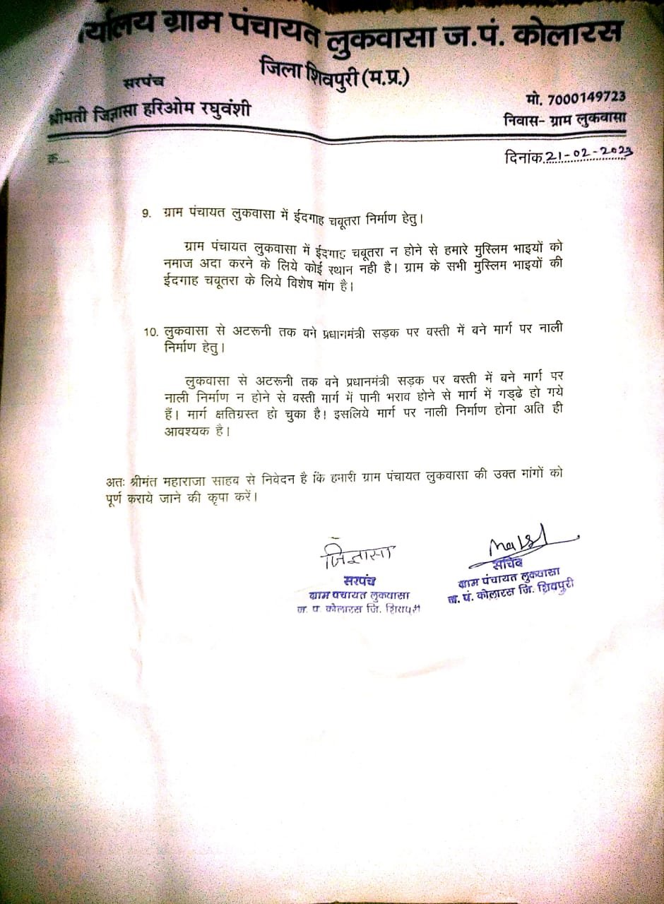कोलारस: केंद्रीय मंत्री ज्योतिरादित्य सिंधिया 21 फरवरी को लकवासा में विकास यात्रा में शामिल हुए थे इसी दौरान लुकवासा सरपंच पति भाजपा नेता हरिओम रघुवंशी ने 10 सूत्रीय मांगों को लेकर केंद्रीय मंत्री को ज्ञापन सौंपा था इसमें प्रमुख रूप से लुकवासा ग्राम पंचायत को नगर पंचायत बनाए जाने की मांग की थी