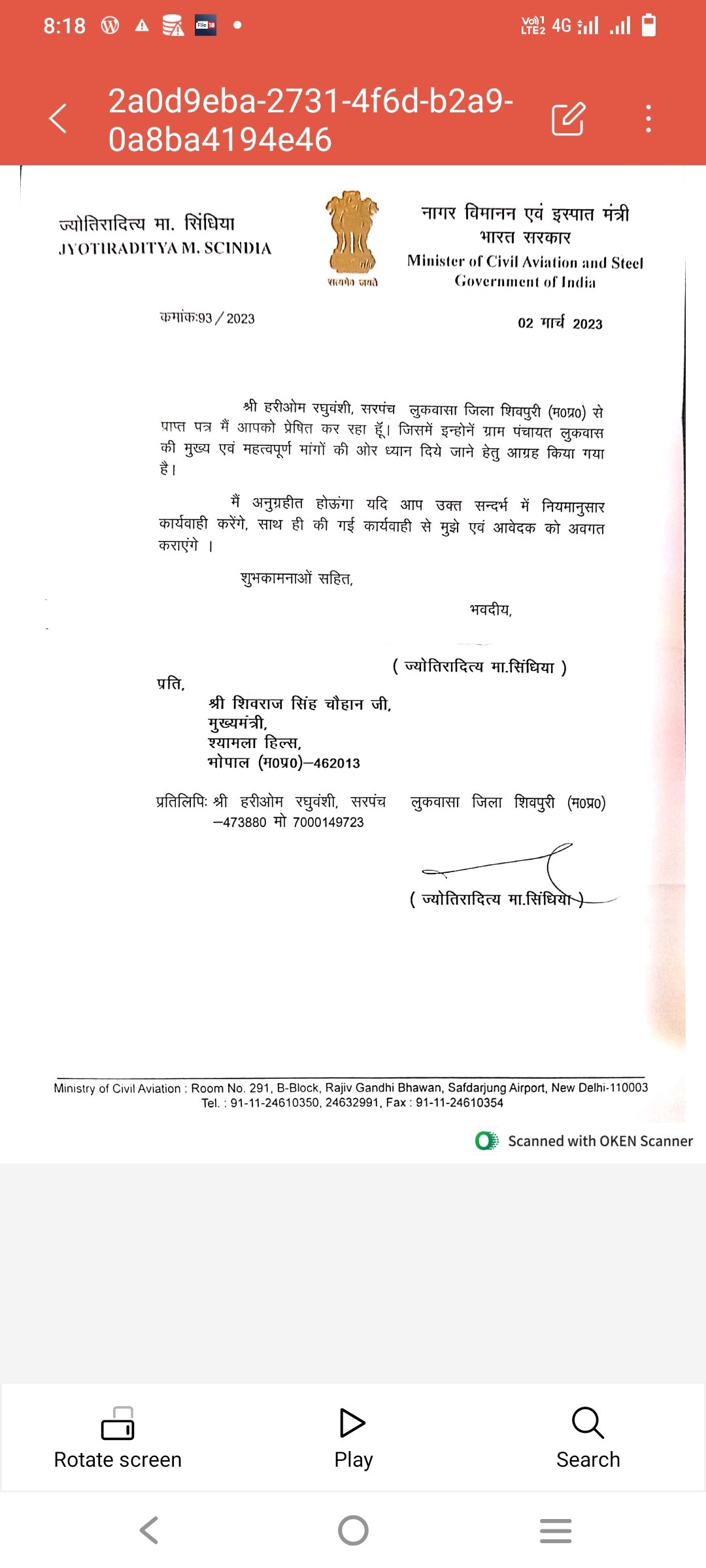हरिओम की मांगों को मंत्री सिंधिया ने प्रमुखता से लेते हुए प्रदेश के मुख्यमंत्री शिवराज सिंह चौहान को मांग पूर्ण किए जाने को लेकर 2 मार्च को पत्र लिखा है संभवता उम्मीद है की 10 मार्च को शिवपुरी जिले के दौरे पर आ रहे मुख्यमंत्री शिवराज सिंह चौहान और केंद्रीय नागरिक उड्डयन मंत्री ज्योतिरादित्य सिंधिया लुकवासा को नगर पंचायत बनाने की घोषणा कर सकते हैं.