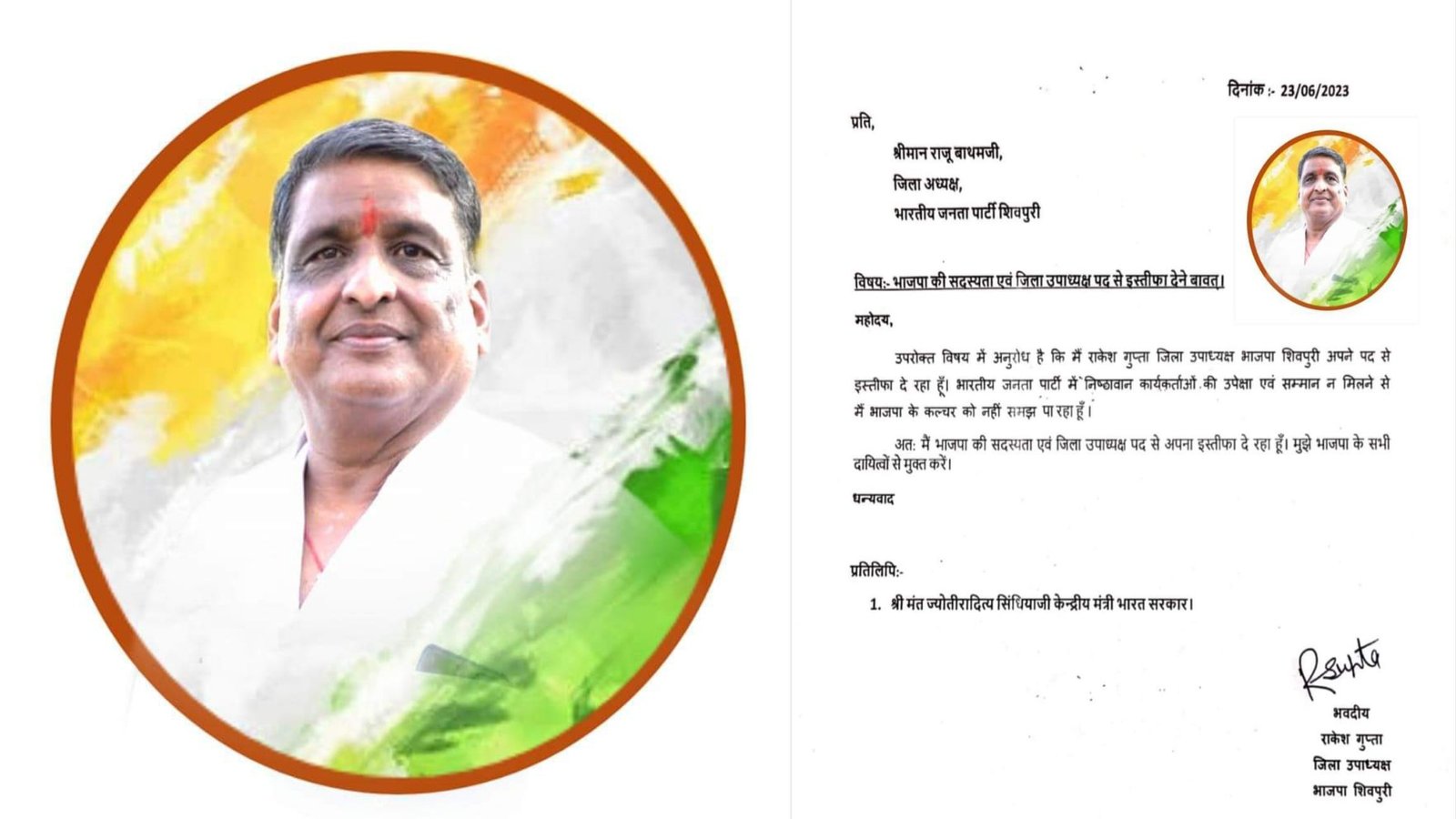 राकेश गुप्ता ने भाजपा जिला अध्यक्ष राजू बाथम को दिए इस्तीफे में लिखा की मैं राकेश गुप्ता जिला उपाध्यक्ष भाजपा शिवपुरी अपने पद से इस्तीफ़ा दे रहा हूँ, भारतीय जनता पार्टी में निष्ठावान कार्यकर्ताओं की उपेक्षा एवं सम्मान ना मिलने से मैं भाजपा के कल्चर को नहीं समझ पा रहा हूँ.