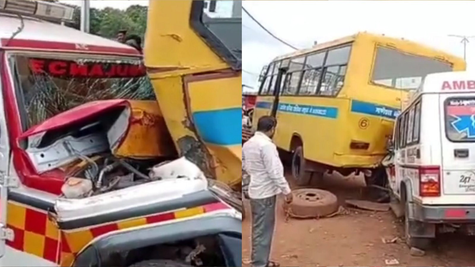 शराब के नशे में धुत्त एम्बुलेंस चालक मे स्कूल बस में मारी टक्कर, बस के आगे खड़ा लोडिंग वाहन भी पलटा / Shivpuri News