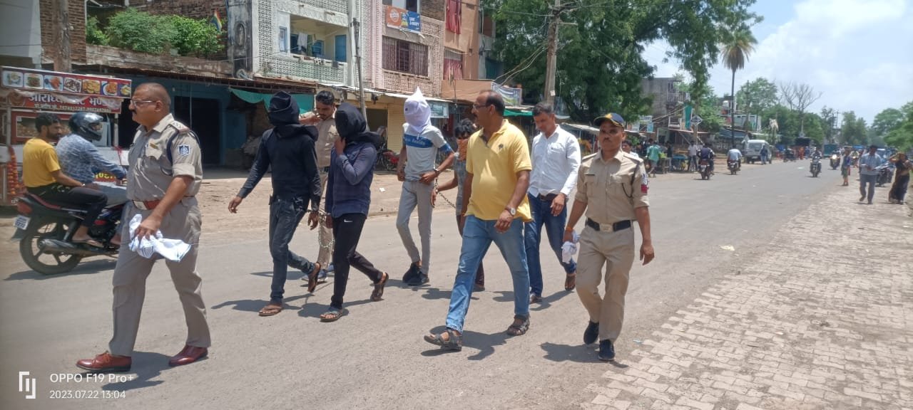 शिवपुरी के बदरवास में नवविवाहिता के साथ गैंगरेप के मामले में पुलिस ने शनिवार को चारों आरोपियों का जुलूस निकाला है। पुलिस आरोपियों को मेडिकल कराने पैदल जुलूस निकालते हुए ले गई। इस दौरान आरोपी मुंह छुपाते रहे।